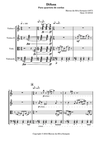 The piece Difusa (Fuzzy) has this title because of the fuzzy, hazy feature of the relationships between its musical contours. In general, these contours have similarities to each other but are not rigidly the same nor different. This composition is an experiment of my Ph.D. research and is documented in the Thesis. The work was premiered by students in the series Concertos Relâmpagos, from the Música de Agora na Bahia Project (MAB), Salvador, BA, September 17 and 18, 2012.
