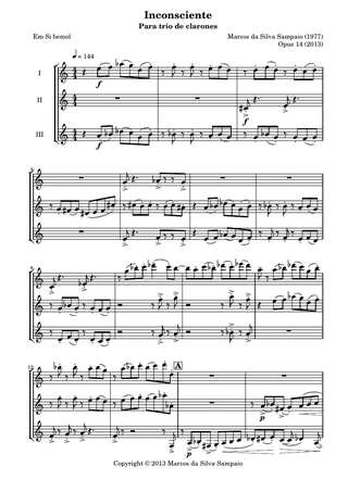 Inconsciente (Unconscious) is a work for a trio of Bass Clarinets. The motivating agent of this composition was the challenge of exploring the sonority of these very low instruments. The reflection on the speed with which the musical ideas appear and disappear stimulated the choice of the title of the composition.