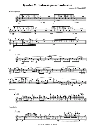I composed Quatro miniaturas para flauta solo in 2004, during a master class with Prof. Bruce Trinkley. At the time, he asked me to compose four miniatures, inspired in an animal, a person, a feeling, and a work of art. Flávio Hamaoka premiered this piece in 2005.