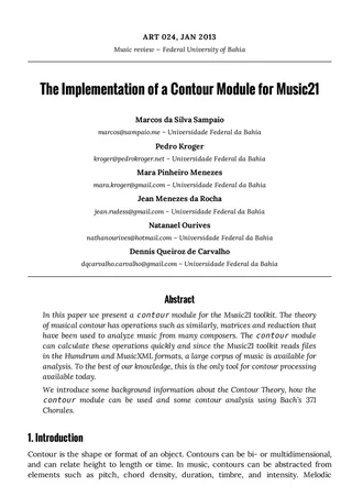 The Implementation of a Contour Module for Music21 Jan 1, 2013· Marcos da silva sampaio , Pedro kroger , Mara pinheiro menezes , Jean menezes da rocha , Natanael ourives , Dennis queiroz de carvalho · 0 min read URL Cite publication Last updated on Jan 1, 2013 Music Contour Authors Marcos da silva sampaio Authors Pedro kroger Authors Mara pinheiro menezes Authors Jean menezes da rocha Authors Natanael ourives Authors Dennis queiroz de carvalho ← Estudo interdisciplinar de obras para flauta solo Jan 1, 2013 A Teoria de Relações de Contornos Musicais: inconsistências, soluções e ferramentas Jan 1, 2012 →